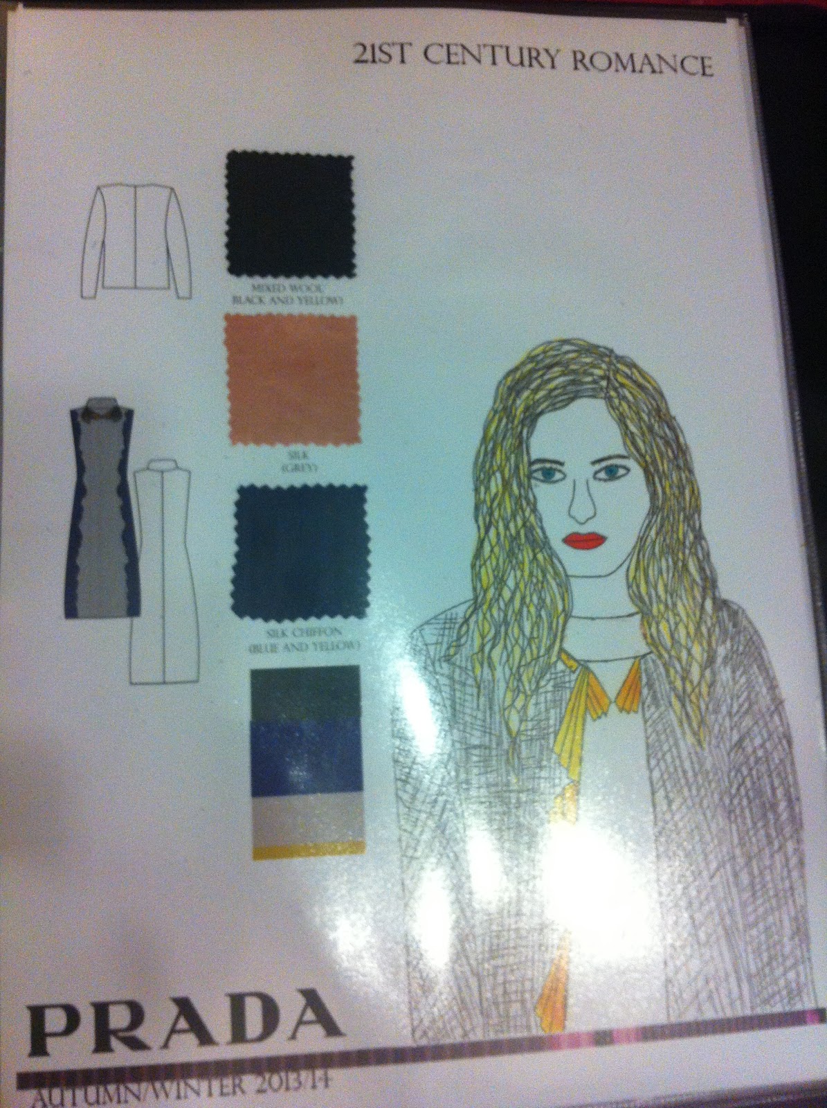 For this project the brief was based on working as part of a design team for a chosen designer. As a group we decided to choose "Prada" as the designer we would design for. The season we had to design for was Autumn/Winter 2013/2014. As a group of five we decided who wanted to do women’s wear and who wanted to do menswear. I had chosen to design for the women’s wear. In order to understand and define "Prada" brand i researched into "Prada" Fall/Winter 12/13 collection. I created two boards pinpointing the key detail such as the pattern style, embellishment and key colours. By doing this helped me to understand what Prada is known for and how i would go about designing part of the women’s wear collection.